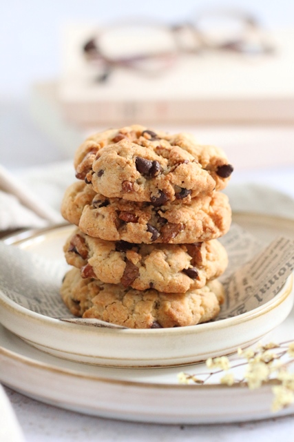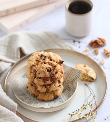 Ces biscuits se situent quelque part entre le cookie et le sablé : une base au beurre fondu qui leur donne un croustillant irrésistible, des éclats de noix croquantes, et des pépites de chocolat noir fondantes à cœur.