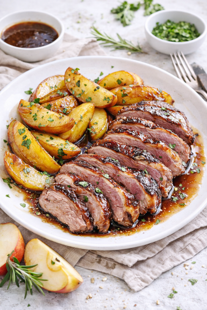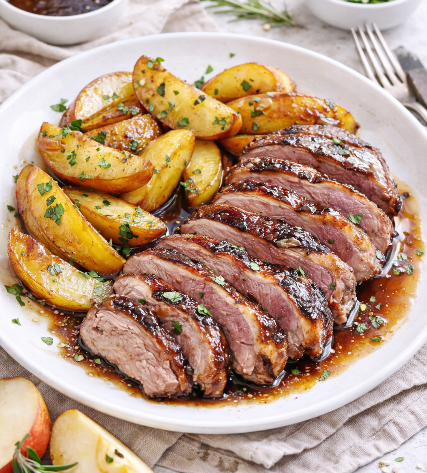 Sortez les magrets du four, coupez-les en tranches, nappez-les de sauce et servez accompagnés des pommes