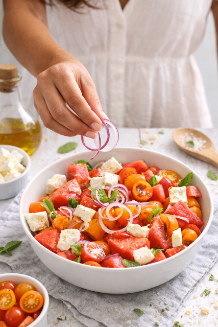 Quand les températures grimpent, notre corps réclame légèreté, fraîcheur et hydratation. C’est dans cet esprit que je vous propose une recette aussi simple que savoureuse : la salade de pastèque, tomate cerise, oignon rouge et feta. Un concentré de fraîcheur et de couleurs, parfait pour égayer vos repas estivaux tout en prenant soin de votre santé.