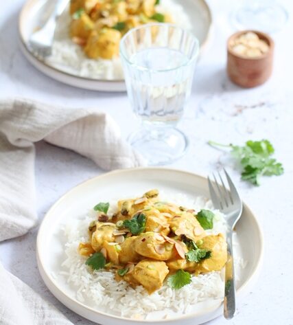 Au moment de servir, parsemez d’amandes effilées et de coriandre. Servez le plat, accompagné de riz basmati.