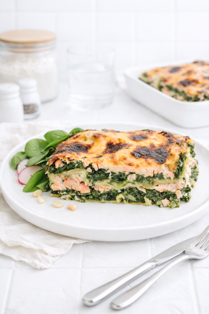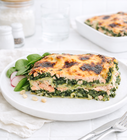 Dans un plat, versez un fond d’eau puis posez une couche de lasagnes. Versez ensuite les épinards, puis une couche de saumon émietté. Salez, poivrez, puis versez une couche de Béchamel. Répétez l’opération et terminez par une couche de gruyère râpé.