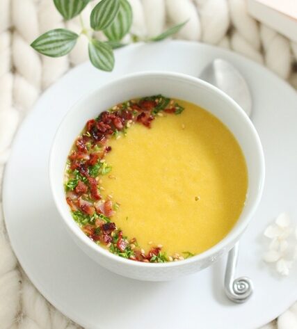Rincez le persil sous un filet d’eau froide, séchez-le dans du papier absorbant puis ciselé-le. Répartissez la soupe dans deux bols. Parsemez de croustillant de poitrine fumée, de graines de sésame et de persil ciselé. Servez aussitôt.