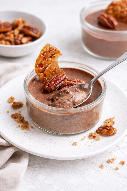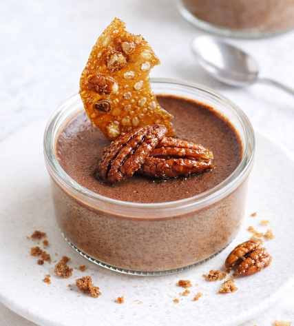 Servez les crèmes au chocolat accompagnées des tuiles de sirop d’érable aux noix de pécan.