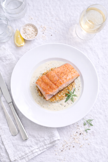 Servez les dos de saumon accompagnés de la crème au topinambour et à l’estragon.