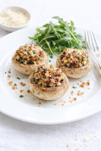 Remplissez les champignons avec cette farce, disposez-les dans le plats, parsemez de thym et de parmesan et enfournez pour 20 minutes de cuisson.