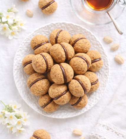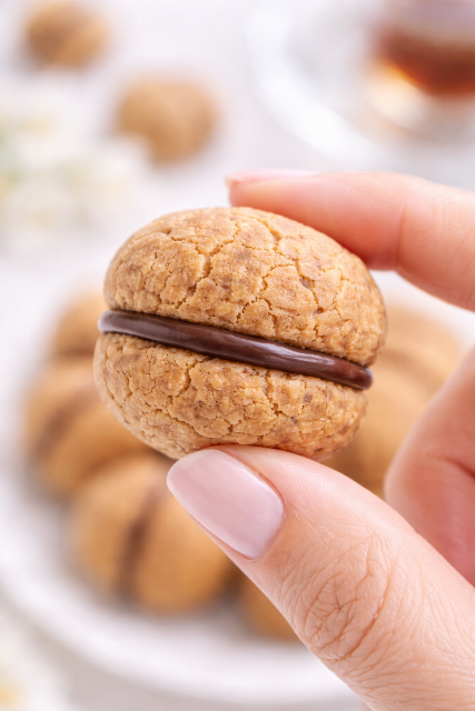 Originaires de la ville de Tortona, ces biscuits sont de véritables trésors de la pâtisserie italienne. Ils sont composés de deux petits dômes sablés à la poudre de noisette, délicatement assemblés par une fine couche de crème à la noisette et au chocolat – la fameuse Nocciolata pour les amoureux des saveurs authentiques. Leur texture est fondante, légèrement friable, avec ce mariage incomparable entre la noisette grillée et la douceur du chocolat. Un pur moment de plaisir à chaque bouchée.