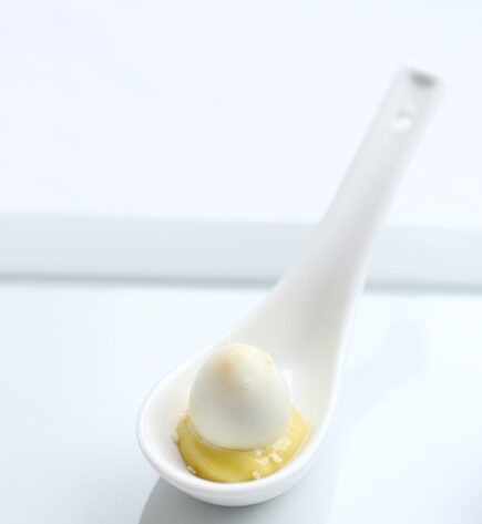 Posez l’œuf de caille sur la mayonnaise, puis ajoutez quelques graines de sésame.