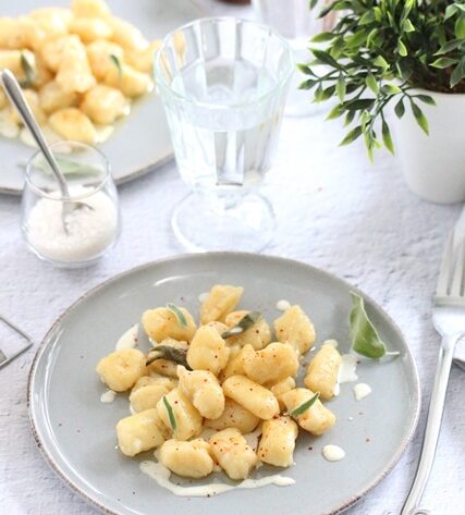 Dressez vos gnocchi dans vos assiettes de service. Assaisonnez de Piment d’Espelette et ajoutez quelques feuilles de sauge puis servez sans attendre.