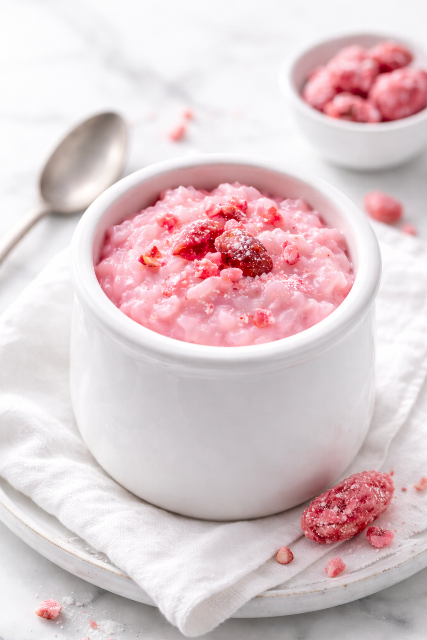 Versez le lait d’amande dans une casserole, ajoutez les pralines roses en poudre et le riz.