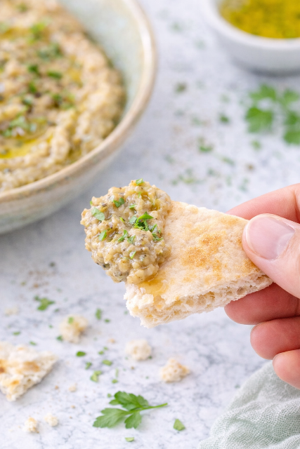 Au moment de servir, ajoutez un filet d’huile d’olive, ajustez l’assaisonnement si besoin et parsemez de persil préalablement ciselé. Accompagnez le mezzé avec du pain pita.
