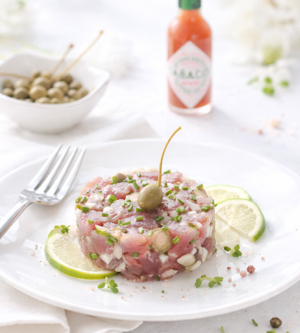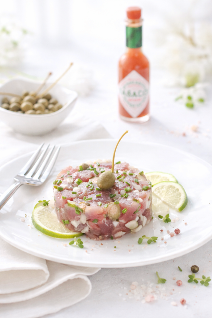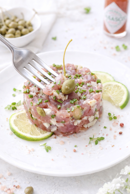 Pour autant, la chair de la bonite, ferme et fondante à la fois, en fait également le poisson idéal pour la réalisation de préparation crue telle que ce tartare aux câpres.