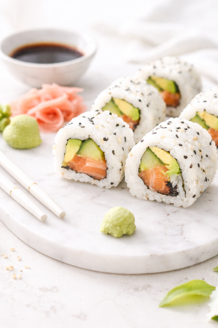 Servez les makis bien frais, accompagnés de sauce soja, de wasabi et de gingembre mariné.