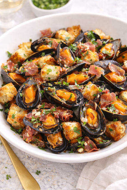 Faites fondre le beurre dans la sauteuse, puis ajoutez l’ail et le persil hachés, ainsi que les croûtons de pain et les dés de jambon. Faites revenir 3-4 minutes sur feu vif, jusqu’à ce que la préparation soit bien dorée, puis ajoutez les moules. Veillez à ne pas ajoutez leur jus de sorte à conserver le caractère croquant des croûtons de pains.