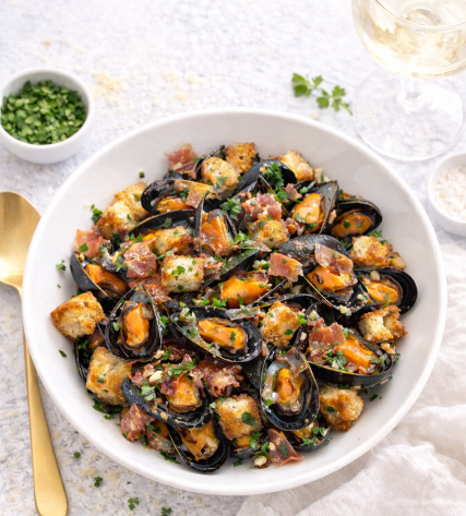 Il s’agissait de Moules revenues dans du beurre, agrémentées de jambon de Vendée, de croûtons de pain de campagne, d’ail et de persil.