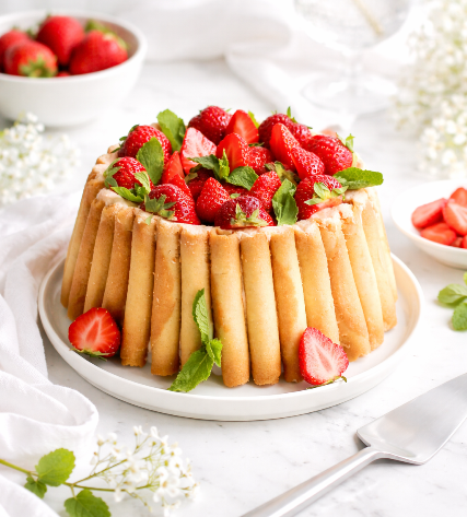 Au moment de servir, démoulez la charlotte dans un plat de service, puis décorez-la du reste de fraises.