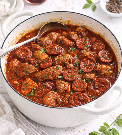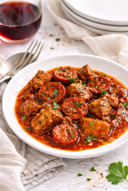 Voici donc un sauté de porc au Porto et au chorizo longuement mijoté en cocotte que vous pourrez accompagner d’un riz pilaf ou d’une simple purée de pommes de terre.