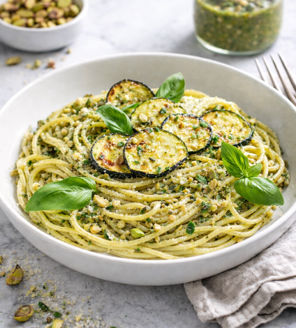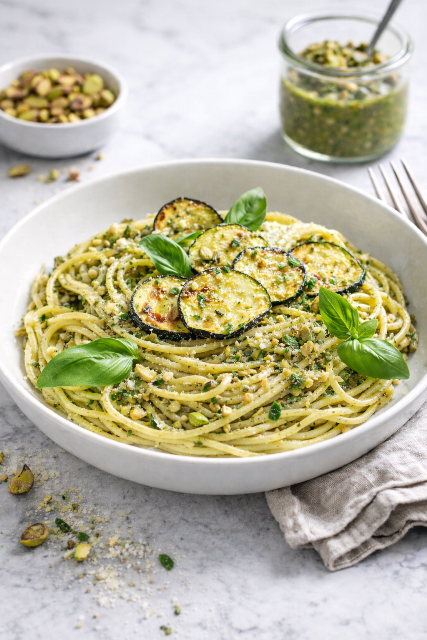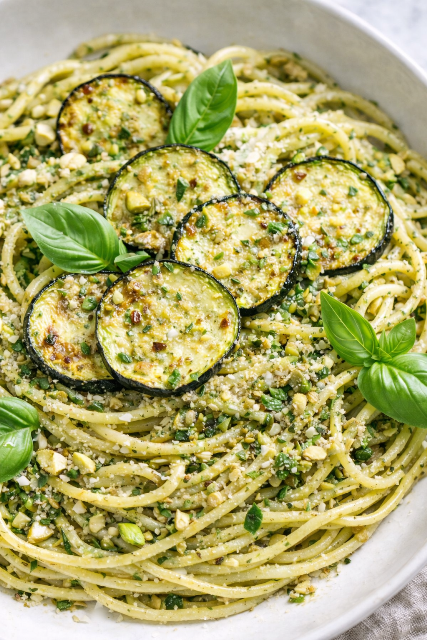 Dans cette recette, la courgette, légèrement grillée et parfumée à l’ail, se marie parfaitement avec la pistache. N’hésitez pas à agrémenter les spaghetti de parmesan râpé et de basilic frais, pour encore plus de saveurs.