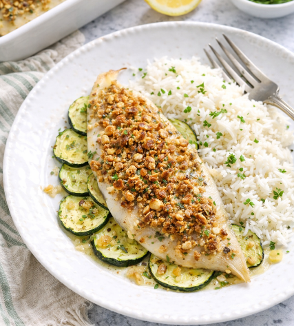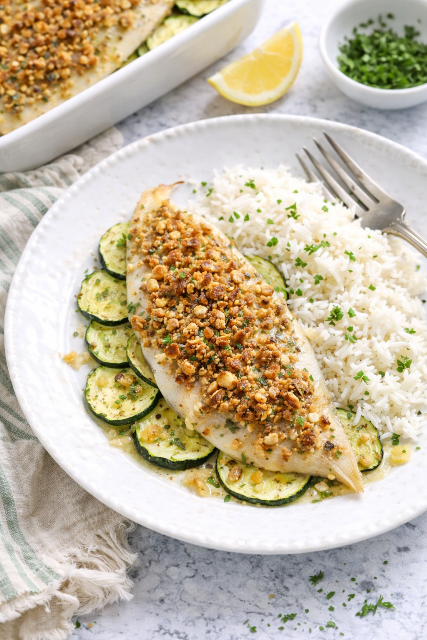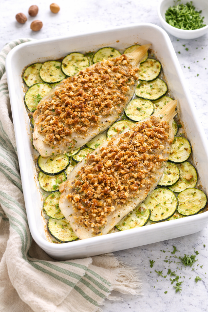 Répartissez le crumble de noisettes sur les soles et réservez.
