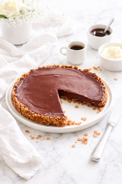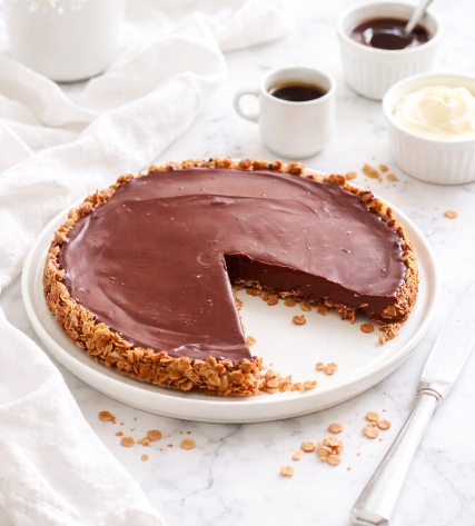 Aujourd’hui, je vous propose une recette originale de tarte au chocolat sur un fond de tarte en flocons d’avoine, délicatement parfumé au miel.