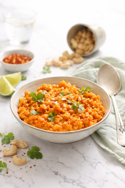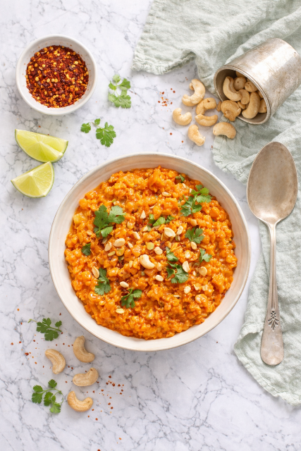 Servez le dahl préalablement parsemé de coriandre fraîche et de noix de cajou concassées.