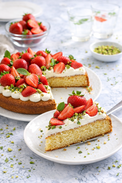 Procédez au dressage: Rincez la menthe sous un filet d’eau froide. Lavez et coupez les fraises en quatre. Concassez grossièrement les pistaches. A l’aide d’une poche à douille, décorez le gâteau avec la chantilly au mascarpone. Disposez les fraises et les feuilles de menthe et parsemez de pistaches concassées.