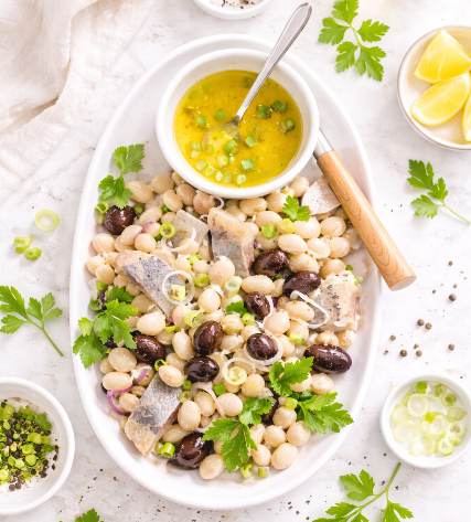 Vous pouvez donc aisément le préparer tiède ou froid, en salade, comme c’est le cas de la recette du jour: une salade tiède de haricots coco au Hareng Fumé & aux Olives Noires de Nice.