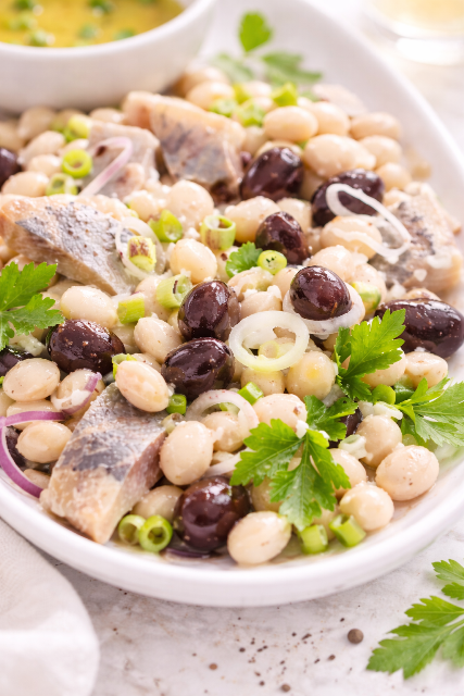 Dans un plat de service, mélangez les haricots préalablement égouttés, le hareng fumé, les olives noires. Ajoutez les oignons et le persil ciselés. Arrosez de vinaigrette, mélangez et ajustez l’assaisonnement si nécessaire. Servez sans attendre.