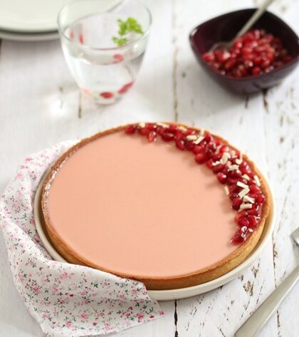 Au moment du service, décorez la tarte avec les grains et le jus de grenade restant.