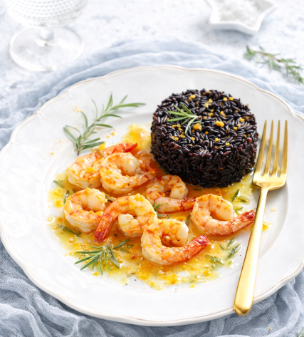 Je les ai accompagnées d’un riz venere qui dispose de note boisée et qui contre balance parfaitement les saveurs fruitées et acidulées du beurre d’orange.