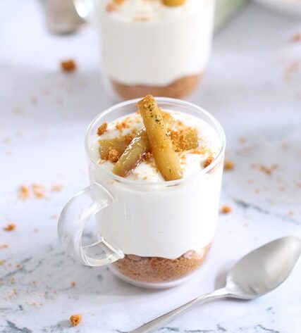La rhubarbe fait son retour discret sur les étals. L’occasion pour moi de travailler cette plante que j’affectionne particulièrement dans un dessert simple et savoureux: des verrines de yaourt grec fouetté au miel, agrémenté de bâtonnets de rhubarbe rôtie à la vanille, sur une base gourmande de spéculoos.
