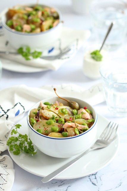 C’est le cas dans la recette que je vous propose aujourd’hui: une salade de pommes de terre nouvelles au saumon, fèves & câprons que vous pouvez servir en entrée, comme en plat principal.