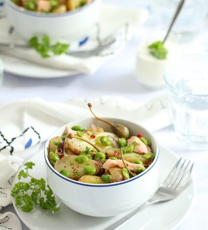 C’est le cas dans la recette que je vous propose aujourd’hui: une salade de pommes de terre nouvelles au saumon, fèves & câprons que vous pouvez servir en entrée, comme en plat principal.