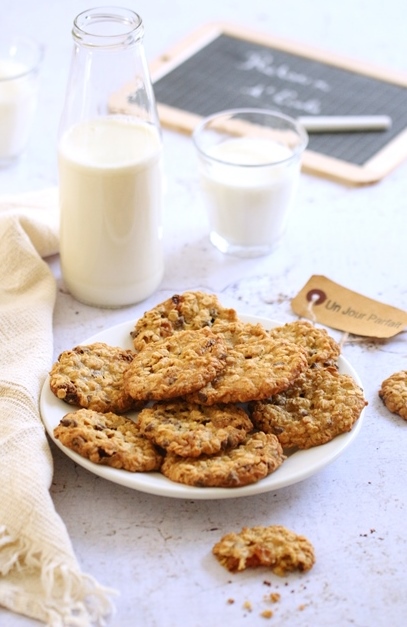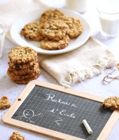 Demain, c’est le retour de nos bambins sur les bancs de l’école. Alors, pour leur offrir un bon goûter (ou petit déjeuner), plein de minéraux, de fibres et de nutriments, je vous propose aujourd’hui de découvrir la recette de ces délicieux cookies aux flocons d’avoine, chocolat noir & raisins secs.