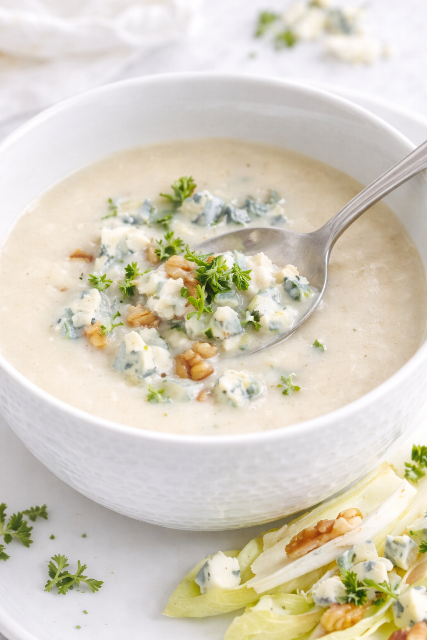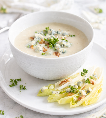 La Fourme d’Ambert, quant à elle, est l’un des plus anciens fromages d’Auvergne. Doux, crémeux et généreux, il apporte rondeur et onctuosité à ce velouté, sans jamais masquer la finesse de l’endive. Ensemble, ils forment un duo équilibré, gourmand et tout en subtilité.