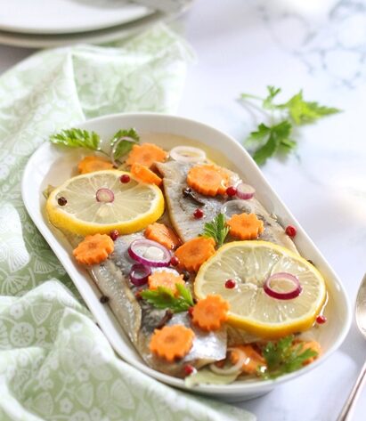 Pour cette recette, le poisson doit mariner minimum 12 heures, mais vous pouvez les laisser macérer une semaine afin qu’ils s’imprègnent complètement des saveurs de la garniture aromatique.