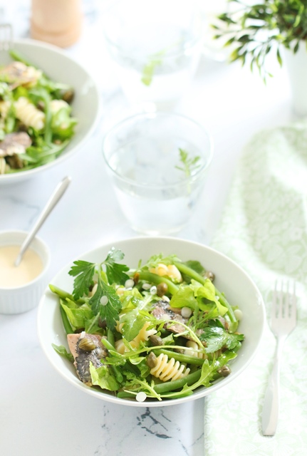 Je vous invite donc à la redécouvrir grâce à la recette du jour: une salade de pâte aux haricots verts, sardines & câpres, agrémentée d’une vinaigrette savoureuse et gourmande.
