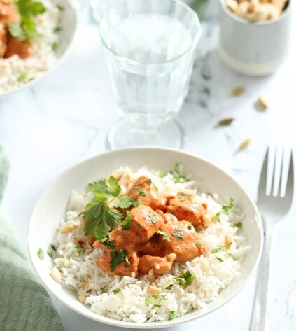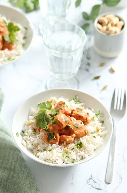 Disposez le butter chicken dans votre plat de service, parsemez de coriandre fraîche et servez avec du riz basmati.