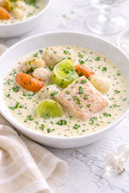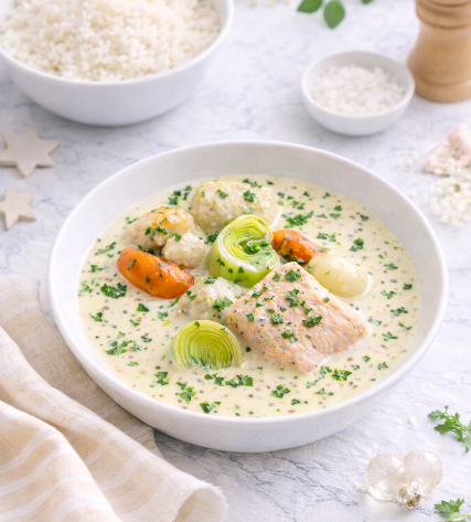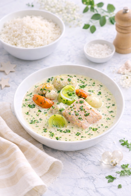 Aujourd’hui, je vous propose de découvrir la deuxième recette de ce menu spécial fêtes et qui fait la part belle aux produits de la mer: Une blanquette de poisson & Saint-Jacques au raifort.