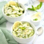Préparez votre sauce: Dans un bol, mélangez le sucre en poudre, le vinaigre de cidre, la mayonnaise et le fromage blanc. Salez, poivrez et versez la sauce dans la salade. Parsemez d’aneth préalablement ciselée, puis mélangez bien.