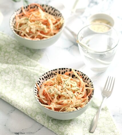 Pelez les carottes puis râpez-les. Emincez le chou finement et réservez. Disposez le tout dans un saladier. Rincez l’aneth sous un filet d’eau froide puis séchez-la sur du papier absorbant.