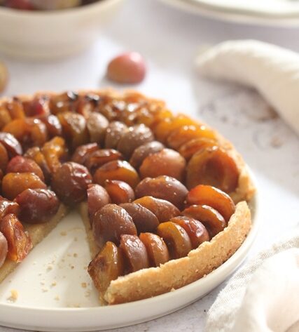 J’ai opté ici pour des prunes rouges, mais la tarte peut tout aussi bien être préparée avec des prunes vertes ou encore des quetsches.