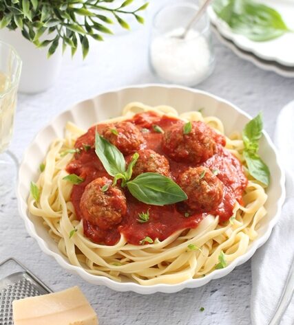 Aujourd’hui on part en voyage direction l’Italie avec cette recette de pâtes aux boulettes (ou polpette) de viande à la sauce tomate. Ce n’est pas la saison de la tomate me direz-vous! Mais pas d’inquiétude, un coulis de tomate de qualité fera très bien l’affaire.