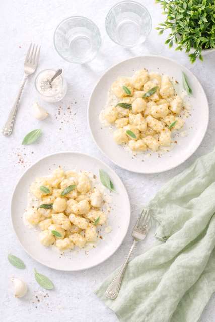 Dressez vos gnocchi dans vos assiettes de service. Assaisonnez de Piment d’Espelette et ajoutez quelques feuilles de sauge puis servez sans attendre.