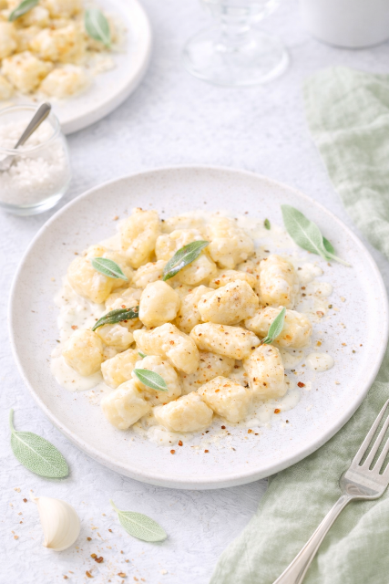 A ce moment, ôtez les gnocchi à l’aide d’une écumoire et plongez-les dans la crème d’ail à la sauge.