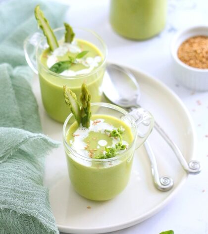 Aujourd’hui, on va célébrer les produits de saison avec une recette estivale légère et rafraîchissante : la soupe froide à l’asperge verte & petits pois. C’est la parfaite manière de profiter des légumes printaniers tout en vous offrant un véritable moment de fraîcheur. Et cerise sur le gâteau ? Elle est simple, rapide et absolument délicieuse !