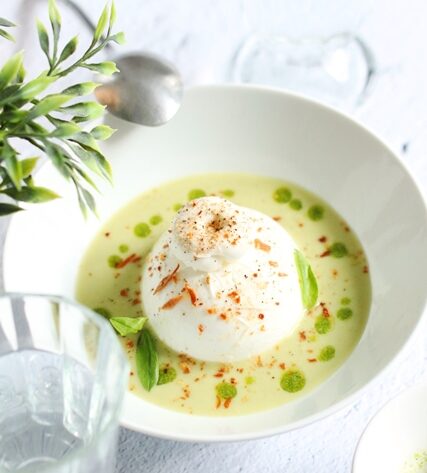 Aujourd’hui, je vous propose une recette simple mais raffinée : Crème de Petits Pois au Basilic, Burrata et Croustillant Jambon de Parme. Une entrée aussi fraîche que savoureuse, idéale pour accueillir les premiers rayons du soleil.
