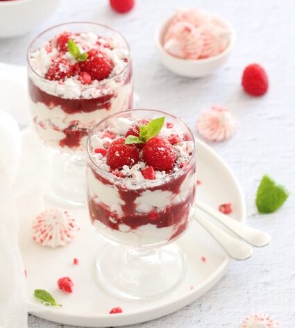 Les framboises, avec leur acidité naturelle et leur texture veloutée, s’associent à merveille à la douceur croquante des pralines roses, ces bonbons emblématiques de la région lyonnaise. Le résultat ? Un jeu de contrastes subtils : le fruité acidulé rencontre le croquant caramélisé, la crème aérienne se mêle à la légèreté des meringues, et chaque cuillère devient une invitation à la gourmandise.