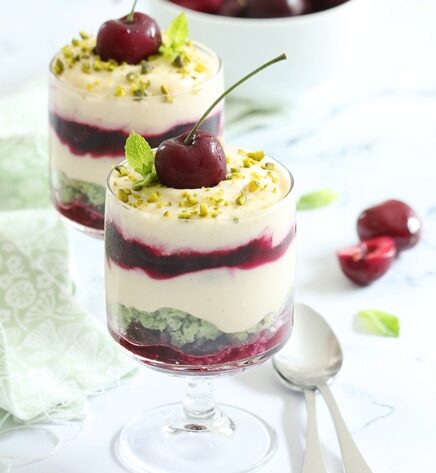 Au moment de servir, parsemez d’éclats de pistaches et décorez avec les cerises fraîches restantes.