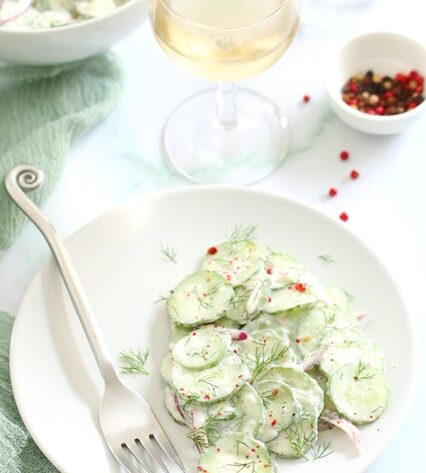 Facile à préparer, élégante dans l’assiette et délicieusement parfumée, cette salade est une vraie bouffée de fraîcheur. L’alliance du croquant du concombre, de la douceur de la crème, de la vivacité de l’aneth et du parfum délicat des baies roses en fait une entrée parfaite ou un accompagnement raffiné.