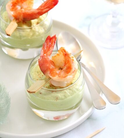 Pour surprendre vos convives dès l’apéritif, cette mini verrine de crème d’avocat au yaourt grec, surmontée d’une crevette au paprika, offre un subtil jeu de textures et de saveurs. Une bouchée en chaud/froid élégante, idéale pour les réceptions, cocktails dînatoires ou apéritifs gourmands.